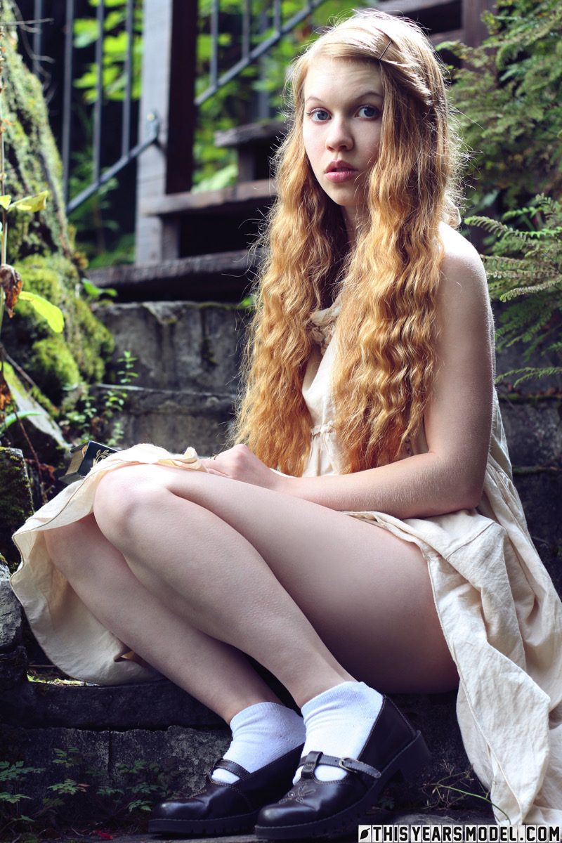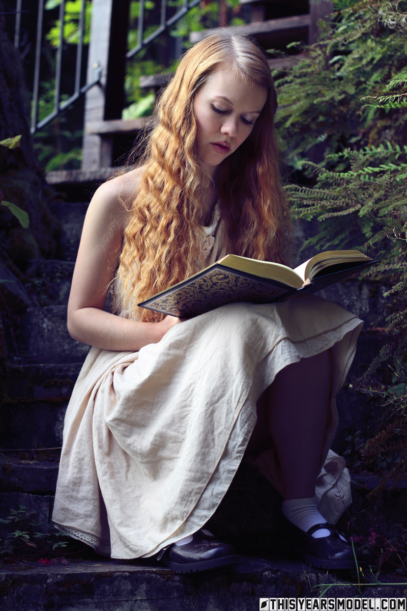Молодая рыжеволосая Долли Литтл обнажается на ступеньках сада во время чтения